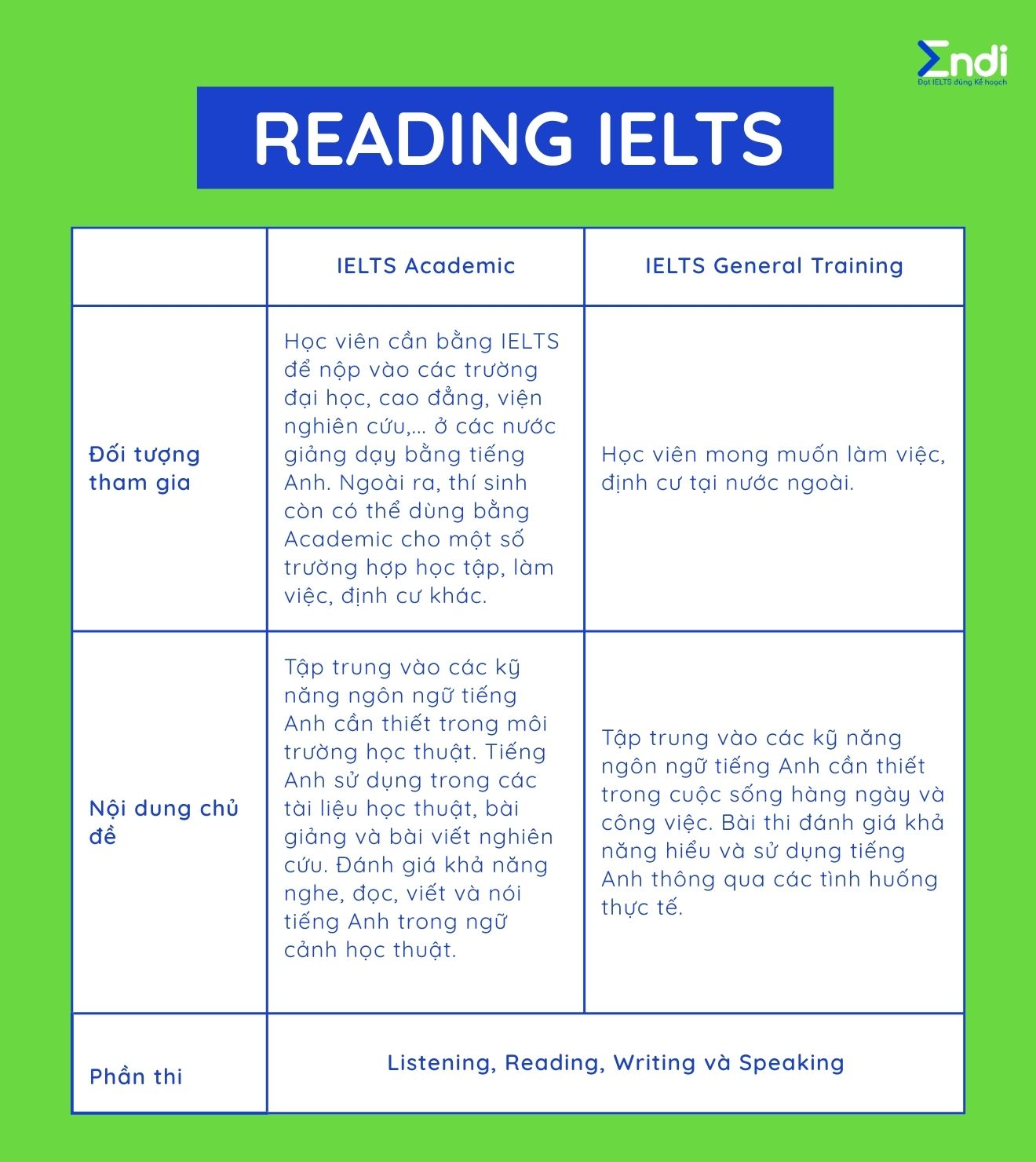 • IELTS General Training: Phù hợp với người có mục tiêu làm việc hoặc định cư. Bài đọc xoay quanh các tình huống đời sống, công việc, thông báo, email, hướng dẫn… mức độ học thuật thấp hơn Academic.