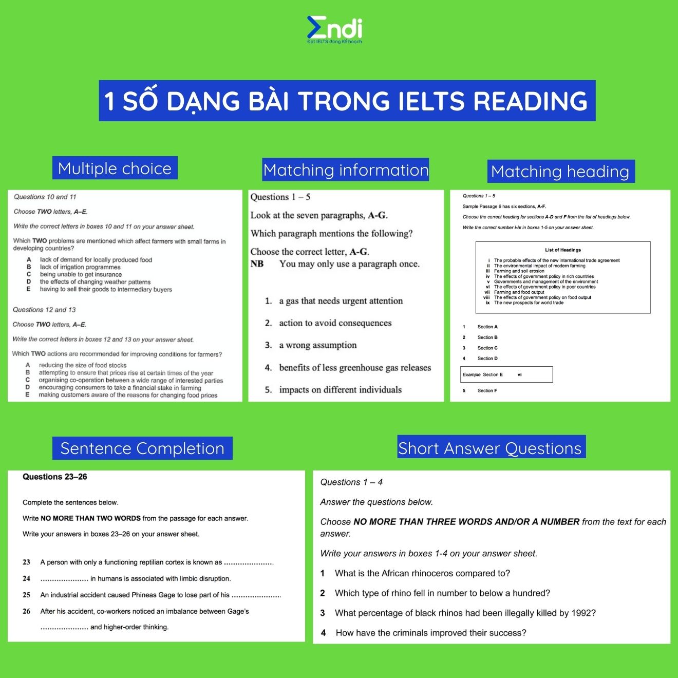 Các câu hỏi bao gồm nhiều dạng, từ câu hỏi trắc nghiệm đến xác định thông tin và quan điểm của người viết, nối thông tin phù hợp, tiêu đề, đặc điểm và câu kết thúc, hoàn thành câu, tóm tắt, ghi chú, bảng, nhãn biểu đồ hoặc biểu đồ, và câu trả lời ngắn.